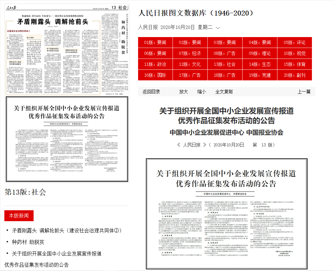 10月20日,《人民日報》第13版用半版版面刊發(fā)了《關于組織開展全國中小企業(yè)發(fā)展宣傳報道優(yōu)秀作品征集發(fā)布活動的公告》,人民網(wǎng)、學習強國等中央媒體和中宣部新媒體學習平臺及時對本項活動做了重點推薦,引發(fā)社會各界廣泛關注;截至發(fā)稿日,學習強國刊發(fā)此項活動的公告消息稿,瀏覽量達6萬多人次,收獲點贊數(shù)2000多個。